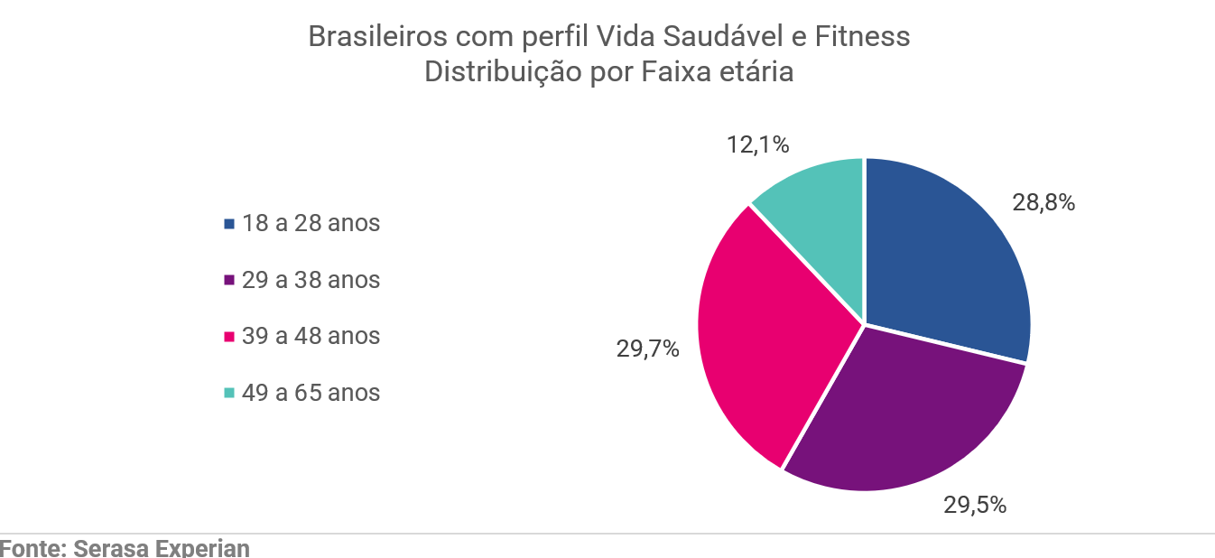 A análise também indica que a afinidade com o tema aparece de forma distribuída entre faixas etárias, com presença consistente entre diferentes gerações, com consistência entre 18 e 48 anos. Esse retrato ajuda a reforçar que "vida saudável e fitness" não é um assunto com uma cara só: Segundo Giroto, há motivações e momentos de consumo variados, que vão de autocuidado e rotina a performance, saúde preventiva e bem-estar no dia a dia. Confira, abaixo um gráfico que detalha a divisão por faixa etária: